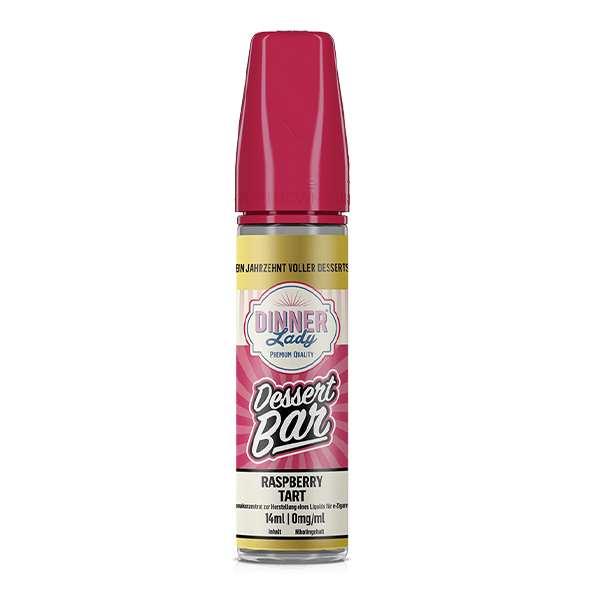 Mit Raspberry Tart zaubern uns die Aromaspezialisten der Dinner Lady aus UK eine französische Kuchenspezialität in Form einer leckeren Himbeertarte in die E-Zigarette. Man nehme einen frisch gebackenen und buttrig-süßen Boden aus Mürbteig, bestreiche ihn mit leckerer Himbeermarmelade und gebe darauf eine frisch aufgeschlagene und lockere Patisserie-Creme mit dem verführerisch-süßen Geschmack edler Vanille. Nun belege man die Tarte mit einer weiteren Schicht aus frischen und sommerlich-süßen Himbeeren, die neben ihrer Süße auch dezent säuerliche Noten mit einbringen und dem Kuchengenuss somit eine unglaubliche Spritzigkeit verleihen. Wenn dir bei diesem Rezept bereits das Wasser im Munde zusammenlaufen sollte, dann ist die Raspberry Tart der Dinner Lady genau richtig für dich! Genieße mit jedem Zug den intensiven Geschmack einer französischen Himbeertarte mit ihren verführerisch süßen und cremigen Noten sowie den sommerlich-fruchtigen Himbeernoten. Da fühlt man sich wie Gott in Frankreich!